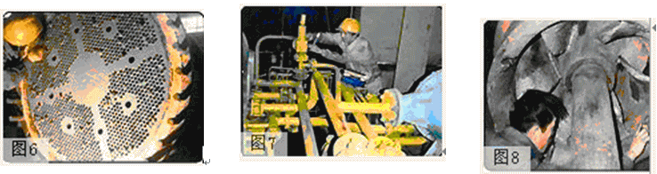 圖8:循環(huán)水泵使用過程中因沖蝕、氣蝕、磨損及腐蝕造成泵殼、葉輪尺寸減薄或蜂窩狀表面。嚴重時造成穿孔,更換維修十分頻繁,使用耐磨涂層對循環(huán)水泵修復后,不僅可挽救了失效零件,而且延長了設備使用壽命??梢袁F(xiàn)場作業(yè)、不拆換水輪、以補代焊、省工快速。