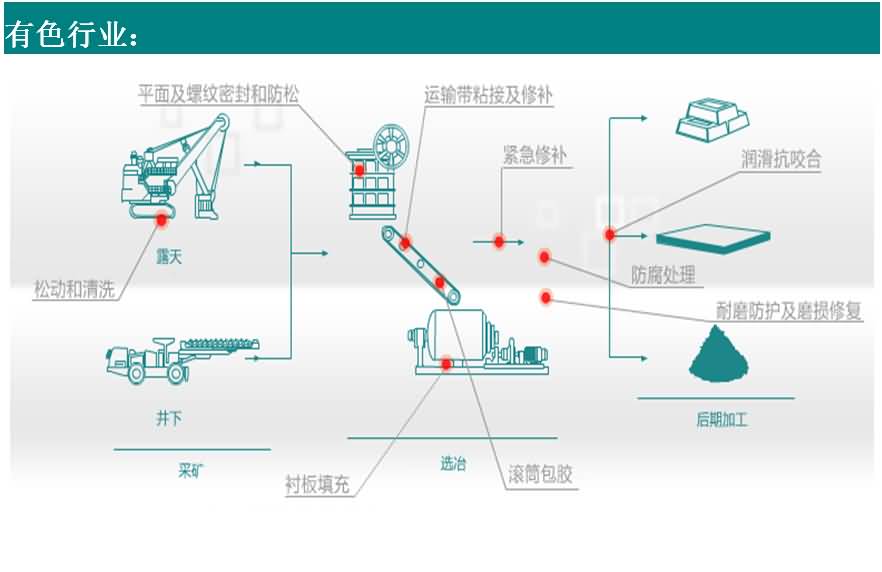 圖2: 礦用橡膠輸送帶斷裂或更換新的輸送帶,傳統(tǒng)工藝用,鋼絲扣或熱硫化連接。用橡膠粘接劑,可以實(shí)現(xiàn)高強(qiáng)度的韌性連接;用橡膠修補(bǔ)劑進(jìn)行封口,減少物料對(duì)接口的磨損,省工、省時(shí),可靠性高圖3: 大型破碎機(jī)大牙松脫,嚴(yán)重影響采掘進(jìn)度。用螺紋鎖固密封劑配合螺栓裝配,大大提高了大牙裝配的可靠性。