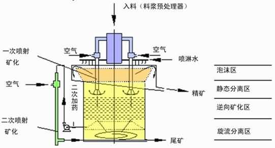 ? 此浮選機是利用浮選柱的原理制作而成,兼有浮選機與浮選柱的優(yōu)點,并有效地克服了兩者的缺點。