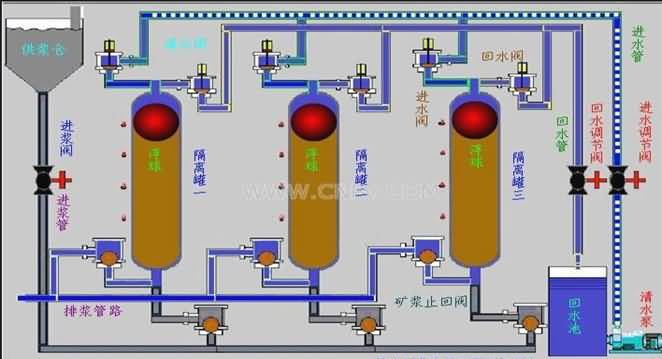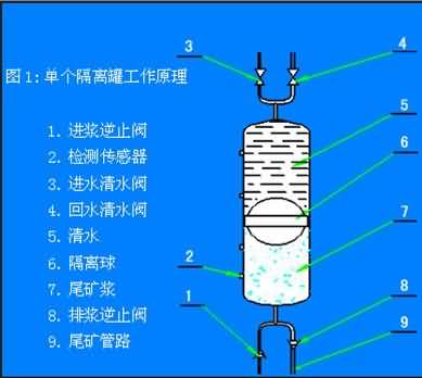 水隔離漿體泵是由高位礦漿池(濃縮池或喂料泵)向隔離罐中浮球下部喂礦漿,再用清水泵向浮球上部供高壓清水,再通過浮球?qū)毫鬟f給礦漿,并把礦漿推到外管線輸送到指定地點。由微機(jī)控制的液壓站驅(qū)動六臺清水閥,使三個隔離罐交替排漿、喂?jié){,實現(xiàn)均勻穩(wěn)定輸送。通過傳感器反饋的信號,微機(jī)對系統(tǒng)進(jìn)行實時監(jiān)控,并由故障診斷專家系統(tǒng)對故障進(jìn)行分析、判斷,再通過可視化系統(tǒng)提示給操作者。該產(chǎn)品的總體思路與原理具有創(chuàng)新性。它利用高效率、長壽命的離心式清水泵作動力源采用巧妙的隔離裝置——浮球,把工作介質(zhì)(清水)與被傳輸介質(zhì)(礦漿)隔離開。隔離裝置即將清水動力傳遞給漿體,還將離心泵的旋轉(zhuǎn)運動方式轉(zhuǎn)變成了容積泵的往復(fù)運動方式。使本產(chǎn)品兼具離心泵流量大,往復(fù)泵揚(yáng)程高的雙重特點。