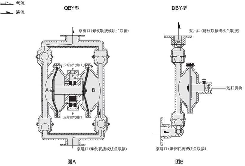 ? 2、在泵的兩個對稱工作腔中,各裝有一塊有彈性的隔膜,聯(lián)桿將兩塊隔膜結(jié)成一體,壓縮空氣從泵的進氣接頭進入配氣閥后,推動兩個工作腔內(nèi)的隔膜,驅(qū)使聯(lián)桿聯(lián)接的兩塊隔膜同步運動。與此同時,另一工作腔中的氣體則從隔膜的背后排出泵外。一旦到達行程終點。配氣機構(gòu)則自動地將壓縮空氣引入另一個工作腔,推動隔膜朝相反方向運動,這樣就形成了兩個隔膜的同步往復運動。每個工作腔中設置有兩個單向球閥,隔膜的往復運動,造成工作腔內(nèi)容積的改變,迫使兩個單向球閥交替地開啟和關閉,從而將液體連續(xù)地吸入和排出。