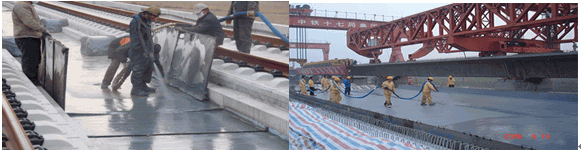 該工程分北京、廊坊、天津三段,六個(gè)梁場(chǎng)同時(shí)施工。全線做防水處理的面積超過1000000m2,聚脲設(shè)計(jì)厚度為2mm,其用量之大,在中國聚脲防水工程中首屈一指,在世界上也是著名的聚脲工程之一。