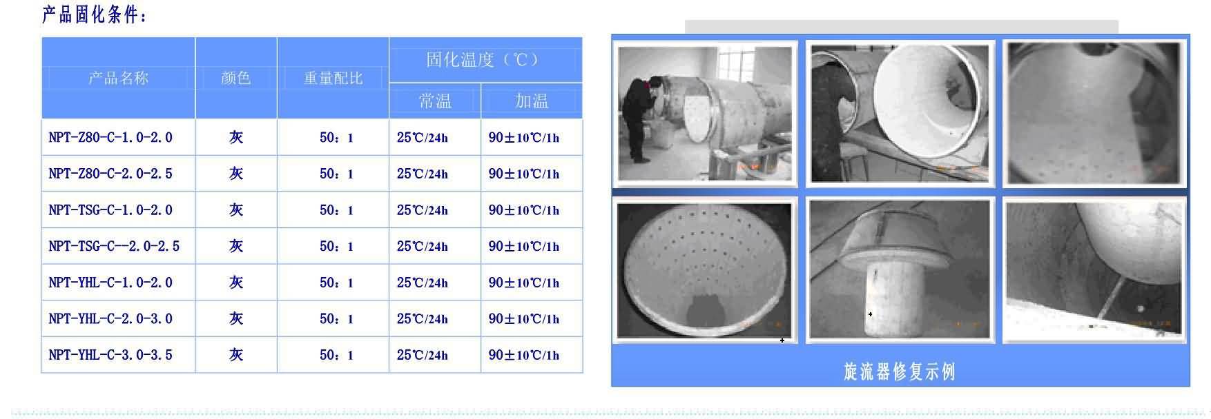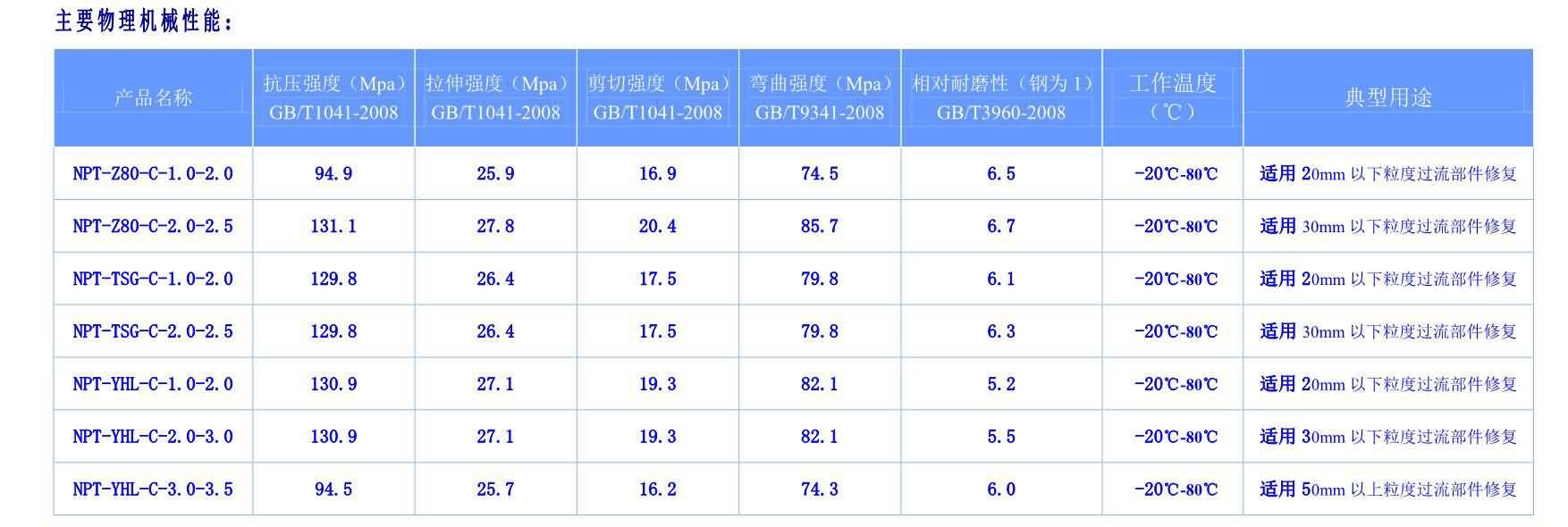 NPT-常溫復(fù)合耐磨材料雙組分,以陶瓷顆粒及復(fù)合陶瓷顆粒、金屬碳化物為骨材與PDMG預(yù)聚體為基礎(chǔ)的耐磨復(fù)合材料,具有耐水、耐油、耐酸堿性。適用(-60℃-80℃)設(shè)備過(guò)流沖蝕、設(shè)備的大面積修復(fù)、設(shè)備預(yù)涂耐磨層,如旋流器、浮選柱、浮選機(jī)、泡沫槽、分級(jí)機(jī)、攪拌桶、溜槽、管件類(lèi)、泵類(lèi)等修復(fù)(典型用途見(jiàn)主要物理機(jī)械性能表)。