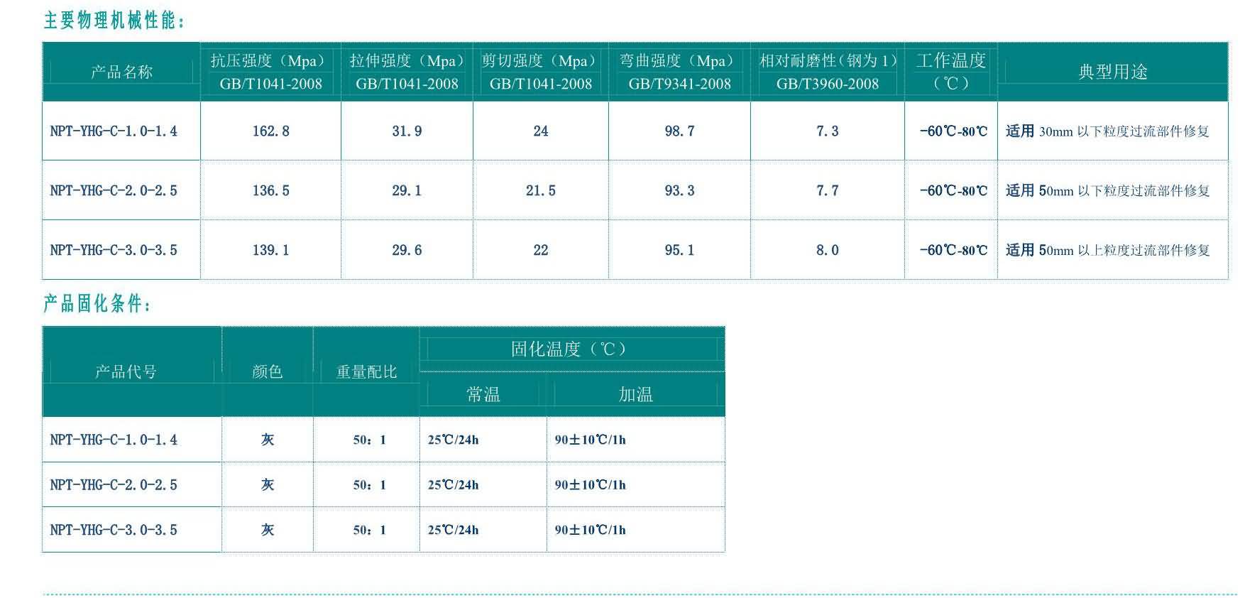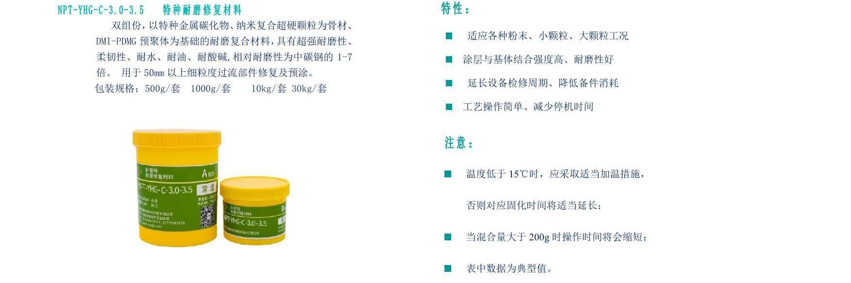 雙組分,以金屬碳化物、納米復(fù)合超硬顆粒為骨材、DNI-PDMG預(yù)聚體為基礎(chǔ)的耐磨復(fù)合材料,具有超強耐磨性、柔韌性、耐水、耐油、耐酸堿性。適用(-60℃-80℃)惡略環(huán)境中設(shè)備過流沖蝕(顆粒大于50mm)、設(shè)備的局部修復(fù)、設(shè)備預(yù)涂耐磨層,如旋流器、浮選柱、浮選機、泡沫槽、分級機、攪拌桶、溜槽、管件類、渣漿泵、脫硫泵、污水泵、往復(fù)泵、隔膜泵等泵類修復(fù)(典型用途見主要物理機械性能表)